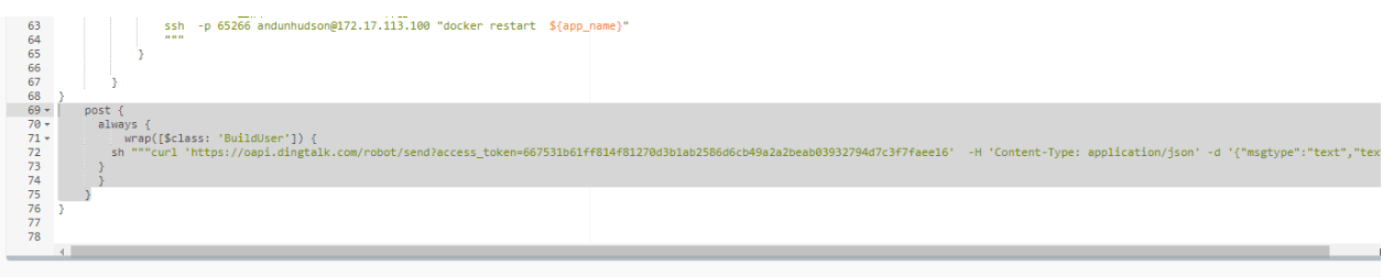 sh """curl 'https://oapi.dingtalk.com/robot/send?access_token=667531b61ff814f81270d3b1ab2586d6cb49a2a2beab03932794d7c3f7faee1' -H 'Content-Type: application/json' -d '{"msgtype":"text","text":{"content": "部署服务:${JOB_NAME} \n构建分支: ${branch}\n构建ID: ${BUILD_ID}\n构建人: ${BUILD_USER}\n提交信息:${commit}构建状态:${currentBuild.currentResult}"}}'"""