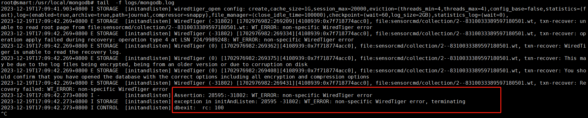 看起来 MongoDB 在启动时遇到了与 WiredTiger 存储引擎相关的问题。具体而言,错误消息显示了有关无法读取根页面以及日志文件可能受到加密或来自旧版本的问题的错误。 数据已经出现损坏,需要我们修复